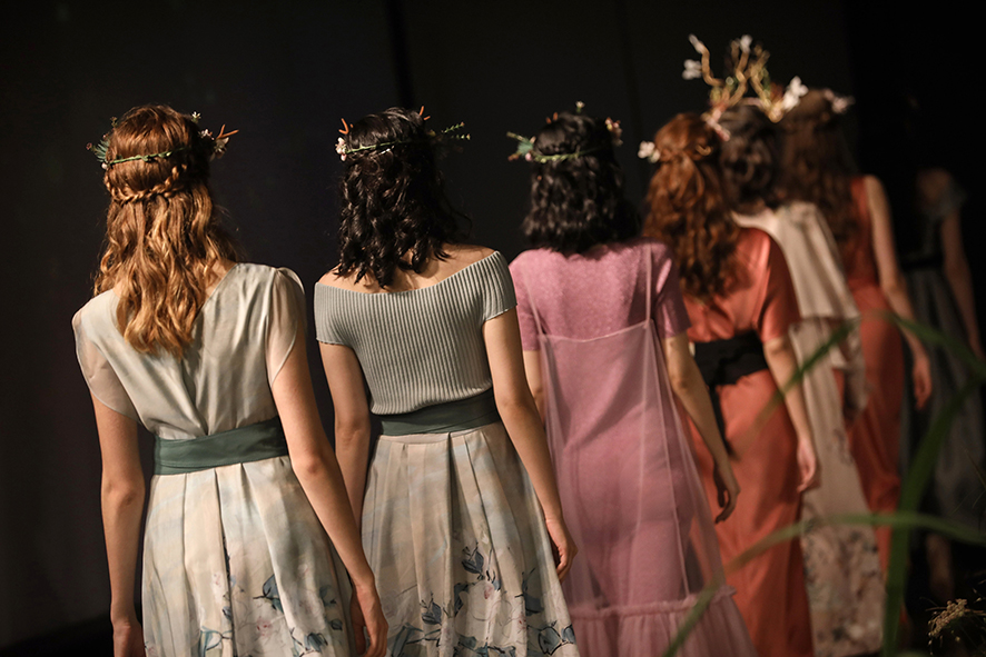 整个秀场以花之秘境的景象为灵感,碧水溪涧的灌木丛林呈现在视野中,葱郁青翠的绿植、野趣静谧的苔藓、恣意绽放的花朵,蜿蜒通幽的曲径,淡烟疏影,闲情自清。